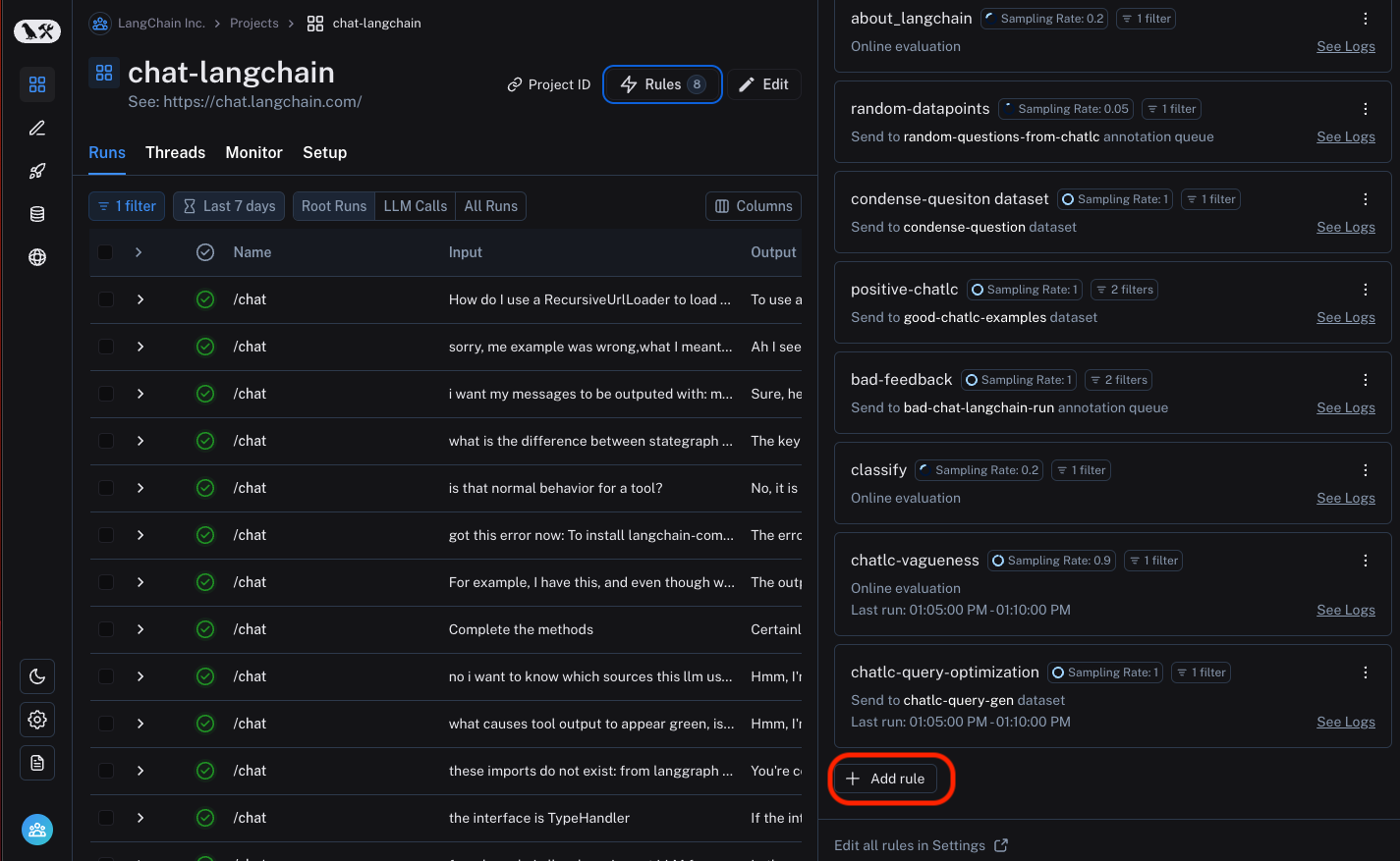 While you can manually sift through and process production logs from our LLM application, it often becomes difficult as your application scales to more users. LangSmith provides a powerful feature called automations that allow you to trigger certain actions on your trace data. At a high level, automations are defined by a filter, sampling rate, and action.